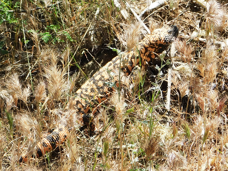 Next, Harry and I decided to drive back into the same hills Ted and I had been in the day before, and check up on some more of Bob and Pat's crests. On the drive in, we saw a gila monster surrying across the road, so we jumped out to get a quick pic before it disappeared into the underbrush :