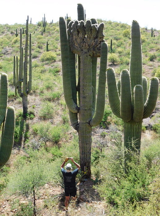 Our next goal was many miles up the highway but was worth the drive — an extra-rare ring crest that we'd had a tip on. After a few minutes of hiking washes and ridges, we found the saguaro less than a quarter-mile from the tipster's estimated location: