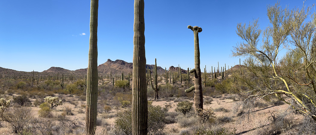 My goal was to find a multi-Y saguaro I photographed from a distance two years earlier, and even in this vast valley I managed to locate it. This is an example of a saguaro that has so many splits close together, I classify it as crested even though it doesn't have a "seam":
