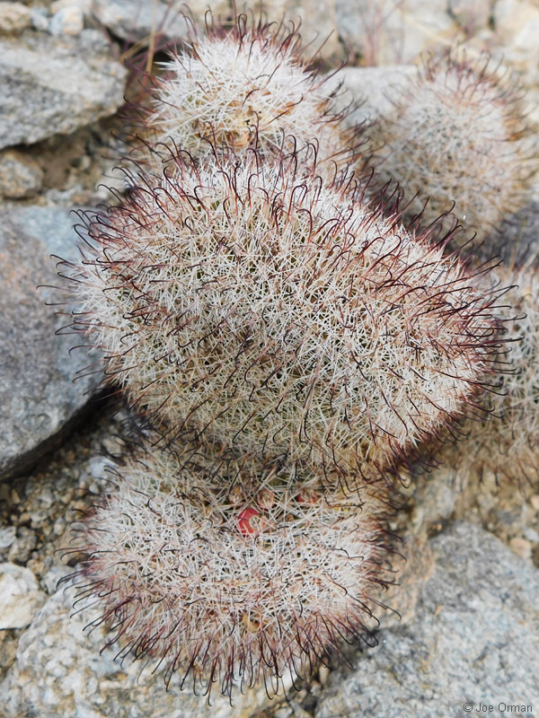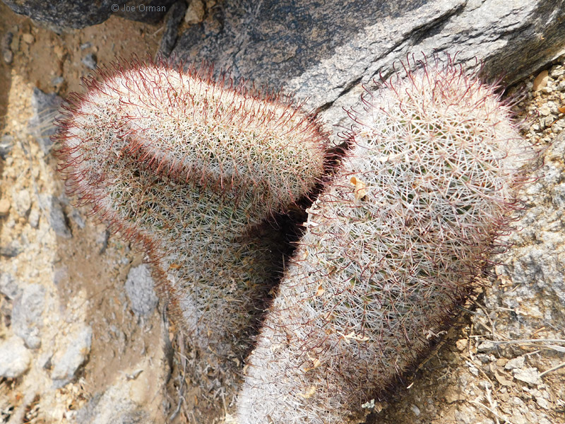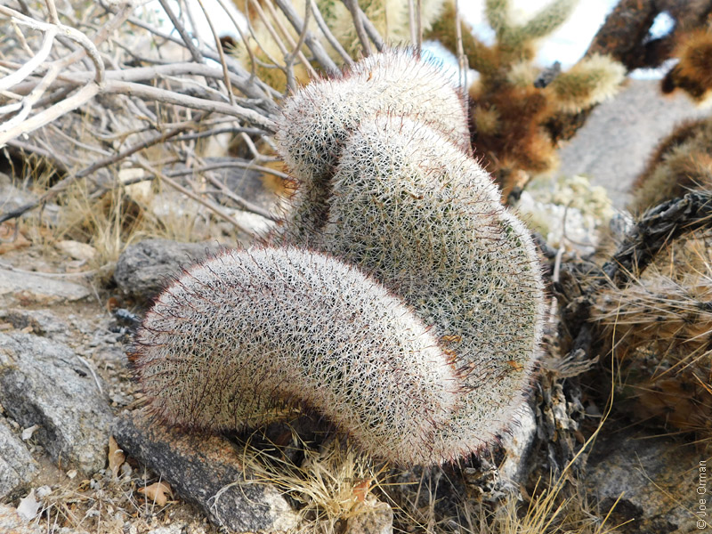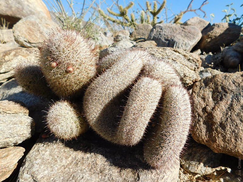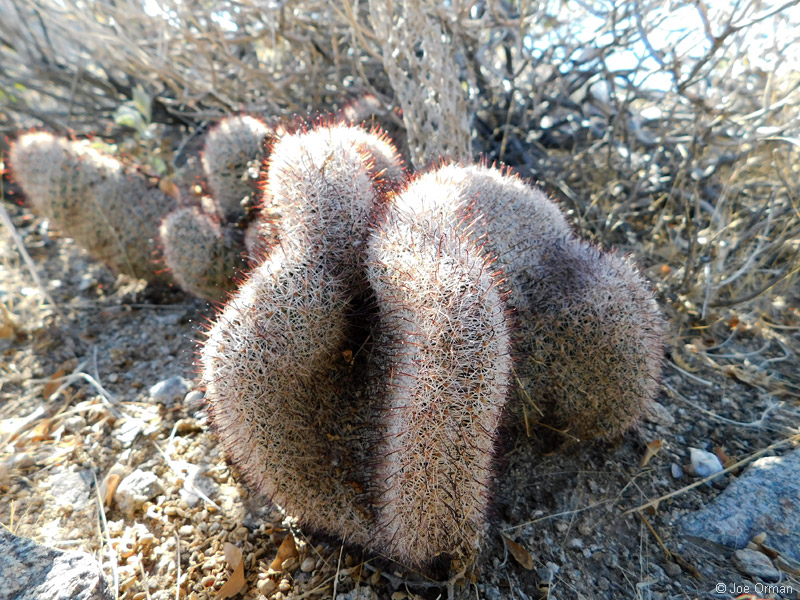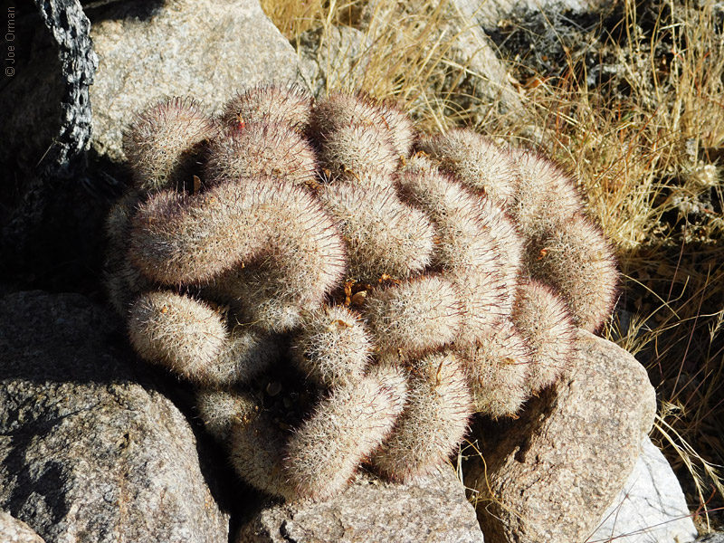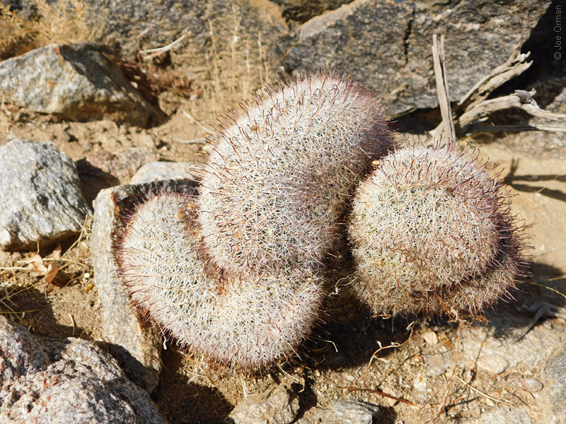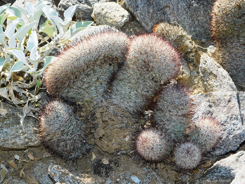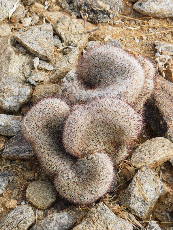 A low, cylindrical cactus with one or many thick-clustered stems grows to 6 inches high. |