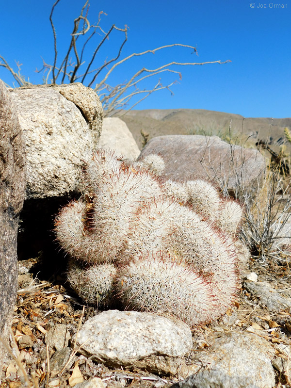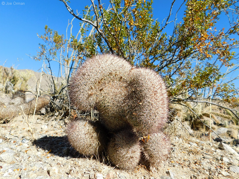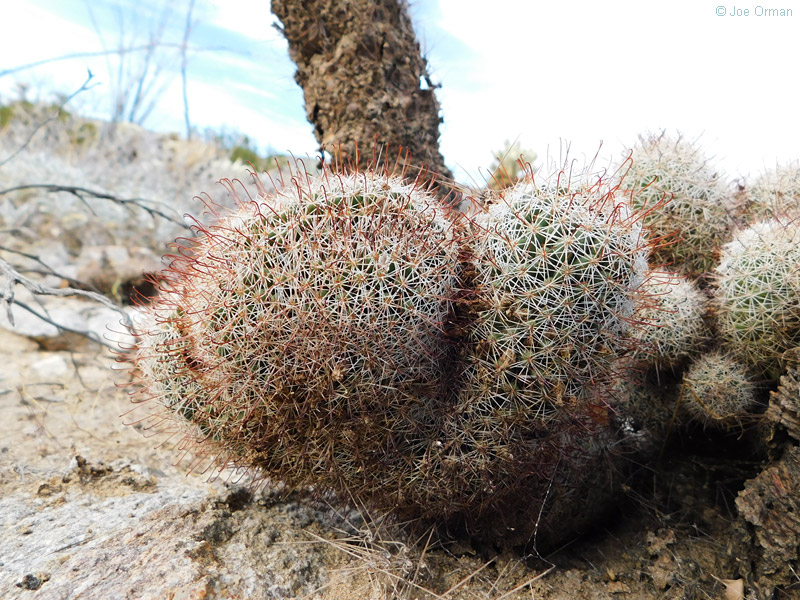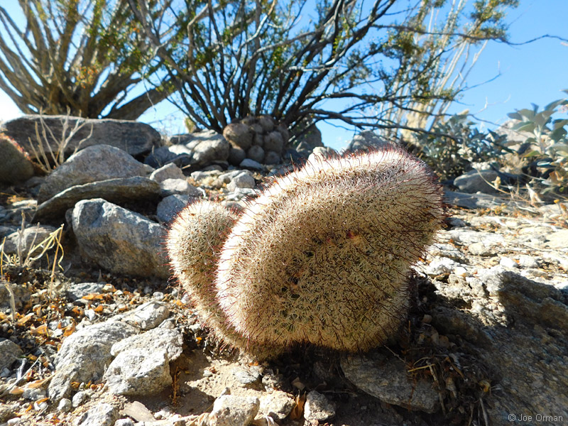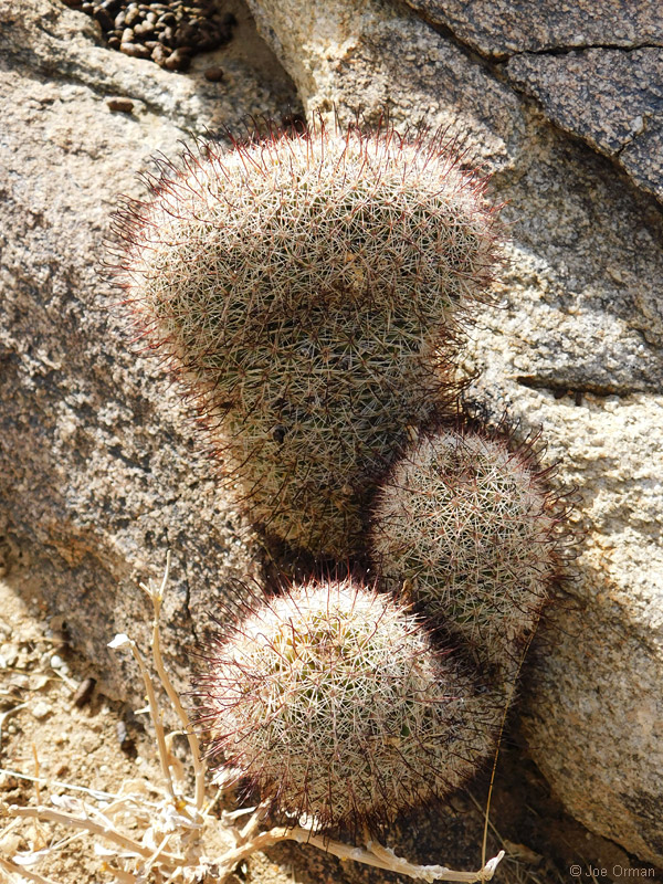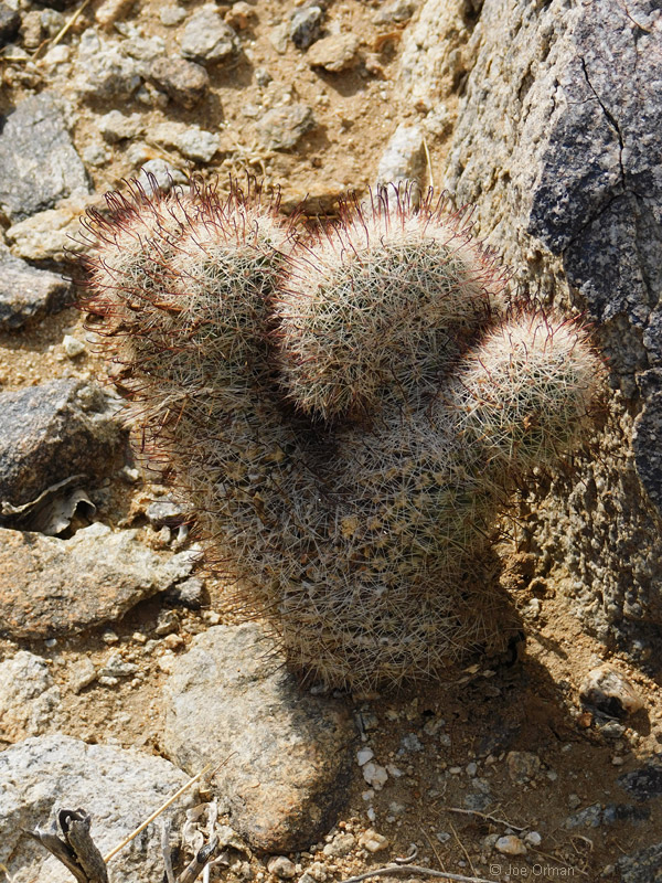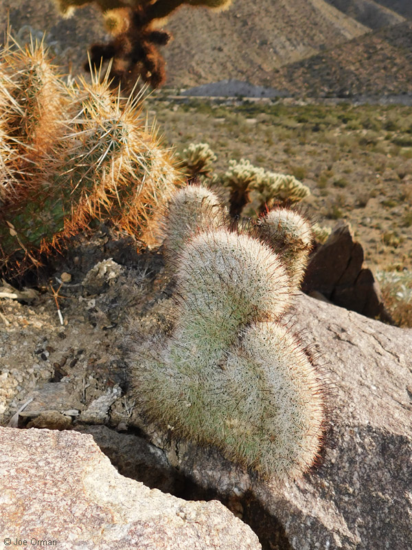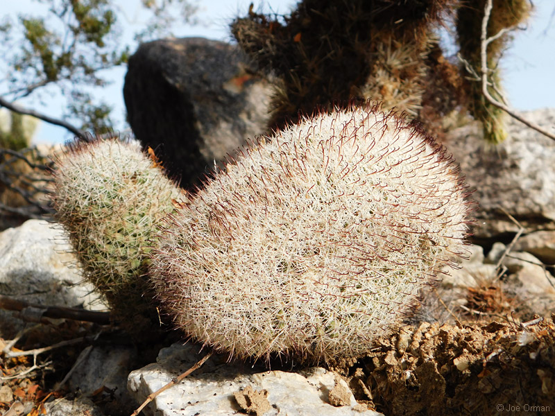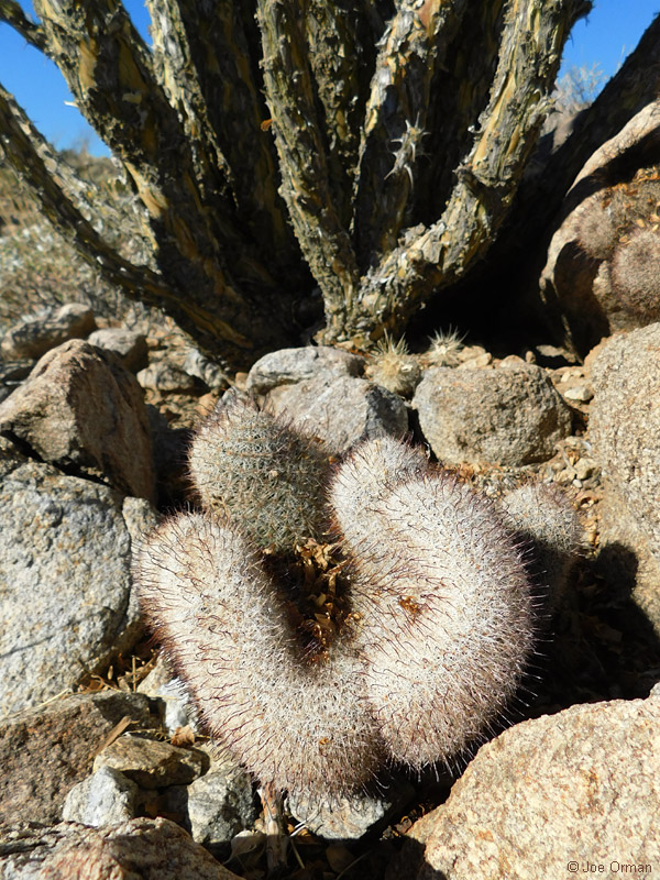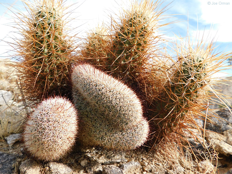 A low, cylindrical cactus with one or many thick-clustered stems grows to 6 inches high. |