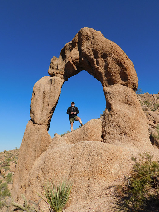 Our next goal was a natural arch that Ted had gotten a tip on (from someone in France!).  We took a rough road as far as my Jeep could manage, then proceeded on foot  the steep terrain was a challenge but we made it!  Here's Ted striking a gallant pose in the arch: