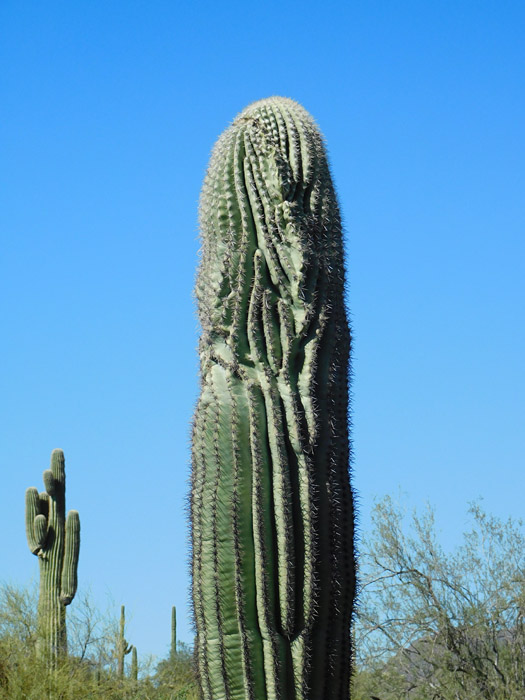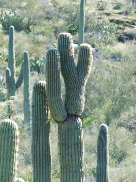When we told her we were planning to go on a hike afterwards, whe directed us to a trail system within the gated community.  Lots of saguaros there, she said — maybe we'd find another crested one!  Sure enough, off one of the trails, Heather and I spotted this crestie: