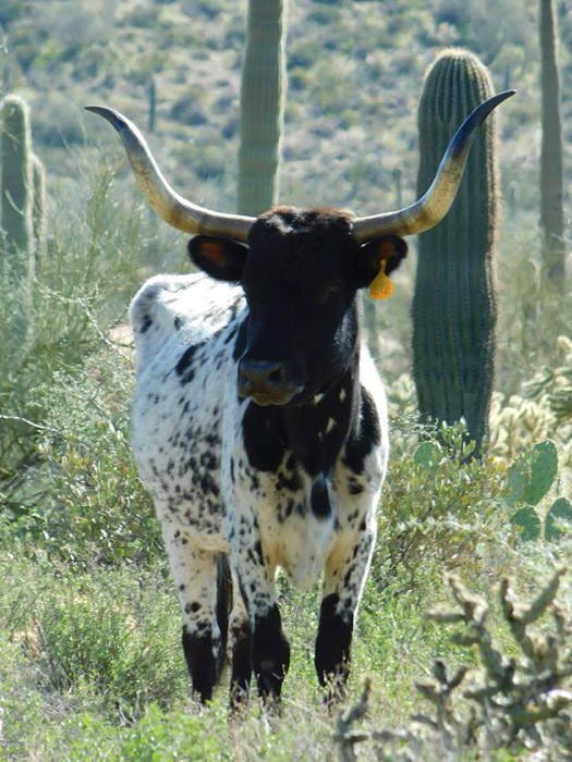 The next day, Heather and I did another hike, this time into a network of trails out in the country, to check up on a tip I'd gotten.  Our route took us past this bull with impressive horns ...