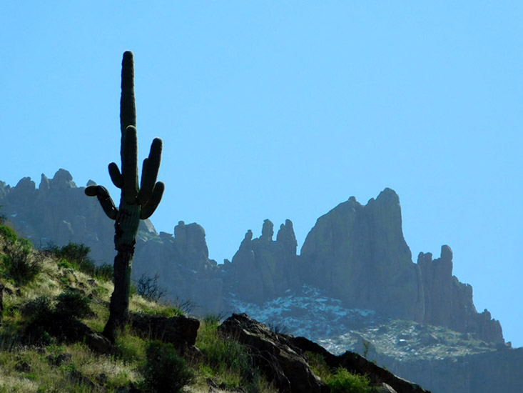 We didn't spot any cresties, but found several "normal" saguaros to photograph — like this one silhouetted against the snow-dusted ridge beyond: