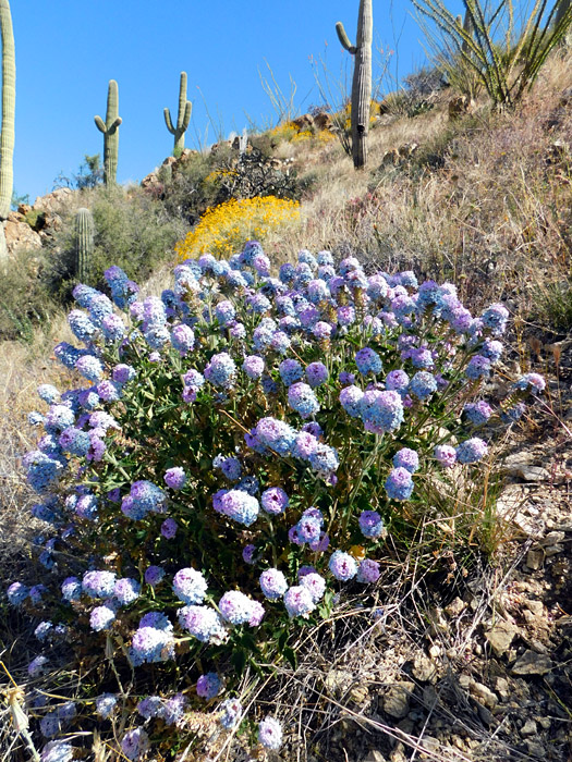 After the meeting adjourned, Harry invited me over to his house, where his wife Caraleen joined us for a relaxing chat on their back patio.  They showed me several specimens of small crested cactus in their back yard; unfortunately I didn't have a camera!  That night I threw down my sleeping bag at a spot in the nearby desert where I'd camped several times before.  Early the next morning, I joined Harry and a homeowner in a nearby gated community.  Before our hike, I snapped an updated photo of the cresting saguaro in her front yard that we've been watching crest out for over a year: