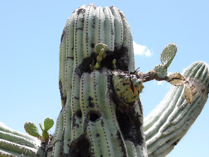 On the same pathway, Harry showed me this saguaro which has several prickly pear cactuses growing out of it!