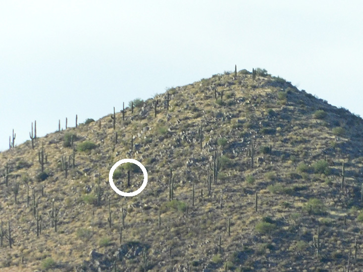 While I was there, I realized I should be able to spot a big top-crest I'd previously documented high on a hill more than a mile away.  Even with my binoculars, I couldn't see it, but I took a telephoto shot anyway and later identified the crested saguaro while looking at the photo on my home computer: