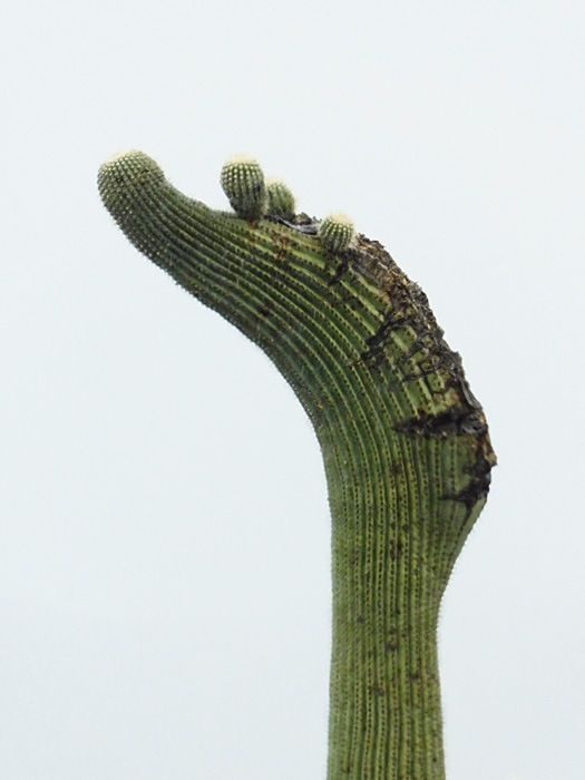 The next day, a steady drizzle began.  I decided to continue my quest, but from the warm and dry comfort of my Jeep.  From the window, I took an updated telephoto shot of a saguaro that was just beginning to crest out when I spotted it three years previously: