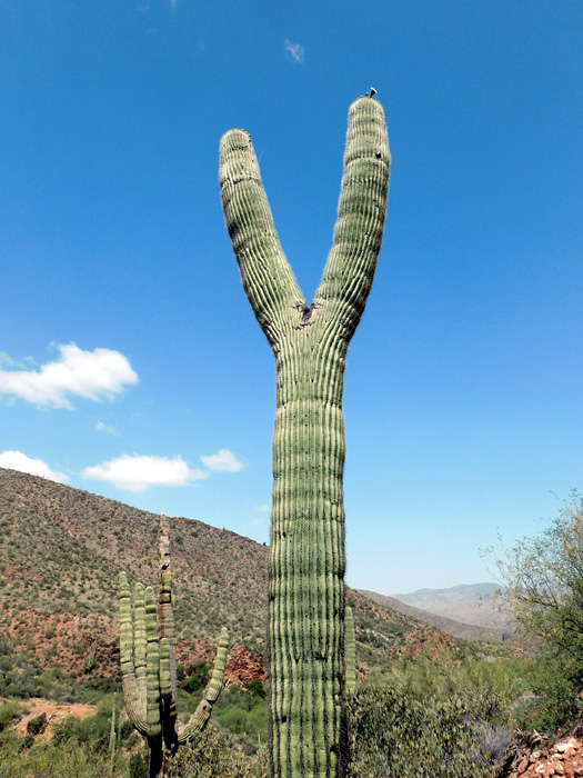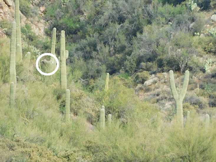 From there, my binos and telephoto lens picked out another crest and a Y-split saguaro farther up the canyon.  I didn't have time to hike to them, so I left them for (SPOILER ALERT!) a return visit: