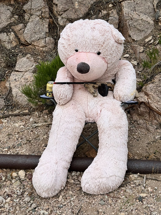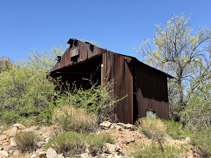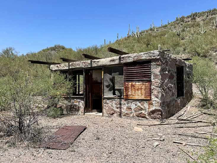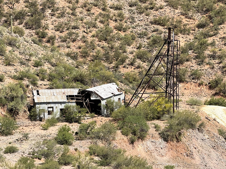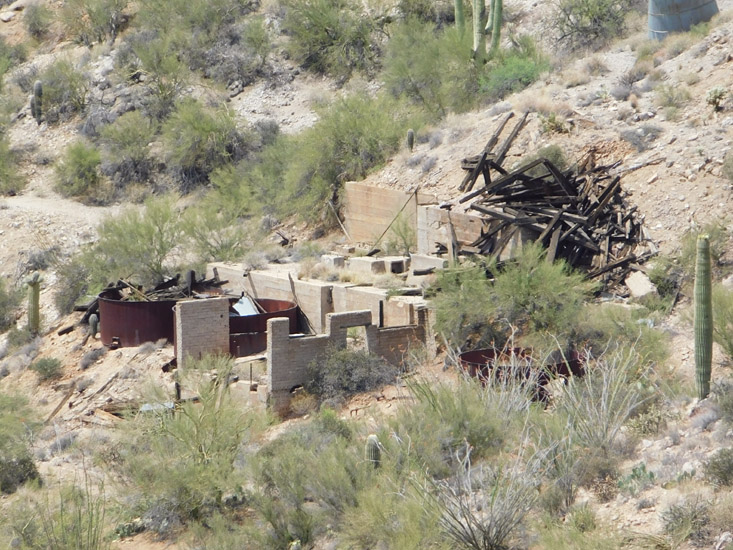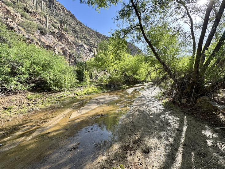 The next morning, I hiked along the river with high hopes for finding a crest — I'd never explored this area before, and the slopes were rich with saguaros!  My route took me past an abandoned dredging operation: