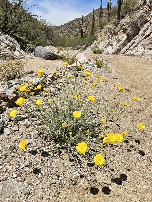 Two weeks later, the temperatures took a dipped unusually low for mid-May, and I returned to the same area.  My first choice for exploration was an old mining road that quickly got too washed out even for my Jeep.  So I parked, put on my big boots, and continued on foot.  Soon, a burst of Desert Marigold greeted me:
