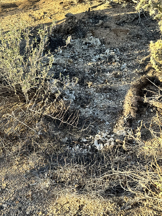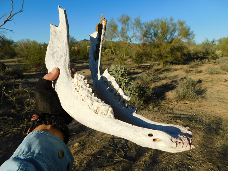 I was trying to find two arm crests I'd had a tip on, but with only a general idea of their locations, I couldn't find them before the lowering sun called me back to the trailhead. Even without finding those crests, I'd had a nice walk in perfect weather in the pristine desert; that was more than enough. On the hike out, I found a scattering of cow bones, including this jawbone: