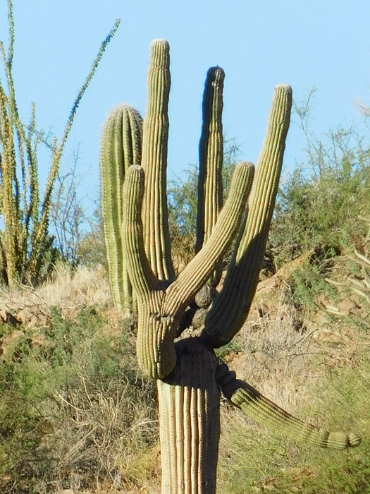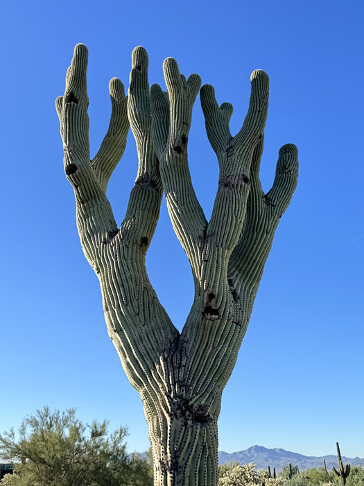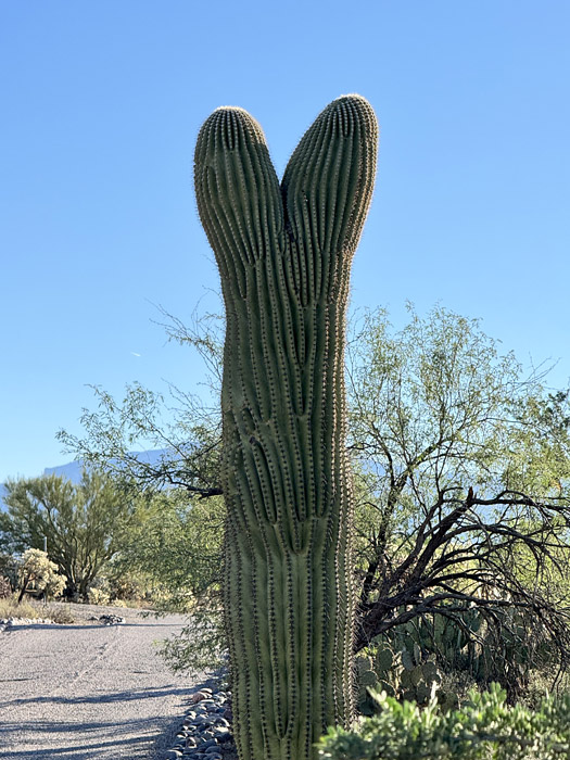Driving away, I spotted this multiple-Y next to a driveway. A saguaro with this many splits but no seam is hard to classify some would call it "crested"!