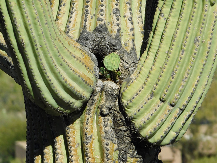 Along the trail back to my vehicle, a saguaro with a prickly pear cactus growing from it: