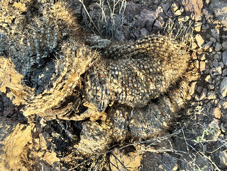 In another neighborhood, I followed up on a tip on a crested barrel cactus, but found it down and very decayed: