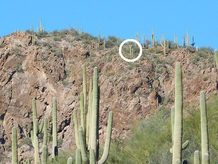 Back at the trailhead, I scanned the slopes above with my binoculars, and happened to spot a crested saguaro clinging to the top of a cliff. SPOILER ALERT: Mick and I would return the next day to hike up to it!