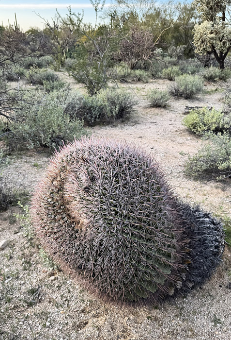 I realized I had less than an hour til sunset, and was still a mile away from the parking lot, so I made a beeline back. On the way I spotted this not-quite-crested barrel cactus: