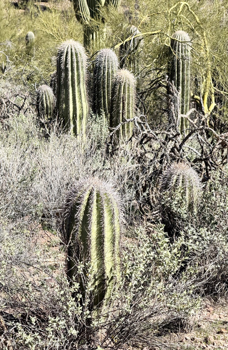 As is my habit, I hiked back to my vehicle by a slightly different route, so I could encounter new delights on the way back. Don't let anyone tell you saguaros don't sprout arms close to the ground!