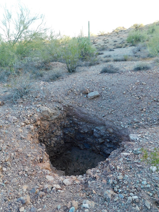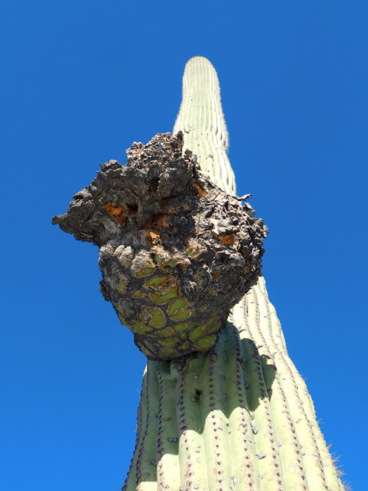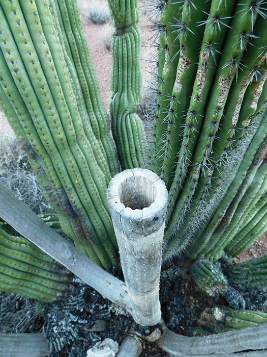 The last time I checked on this one (seven years previously) it was healthy, so I was surprised and saddened to see the saguaro dead and the crest rotting on the ground: