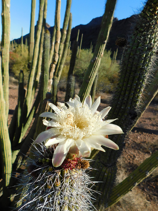 The next morning, I was surprised to see a single blossom on the organ pipe next to my campsite ... usually they don't bloom until May through June (my Extend-O-Cam provided the close-up):