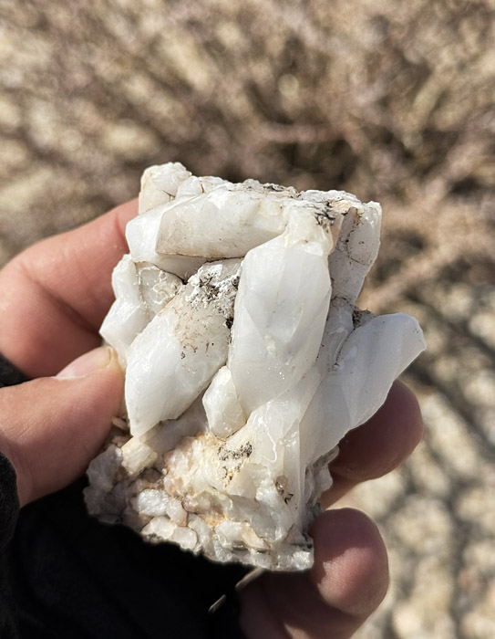 I parked and started hiking into a nearby range of low hills. My route took me across a slope strewn with quartz crystals (no collecting in the national monument!):