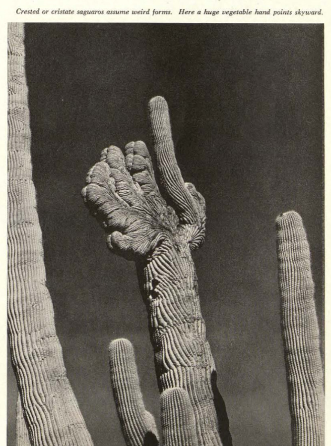 Arizona Highways, October 1950 (photo by Josef Muench) From the article In The Land of The Desert Giants by Joyce Rockwell Muench: "While not many diseases or pests attack the Saguaro, an injury to the circular cell group at the apex sometimes produces the crested or 'cristate' forms. Weird and interesting, they are actually a sort of cancerous growth where the cell grows too rapidly and may be caused by bacteria or perhaps the stab of a bird's bill."