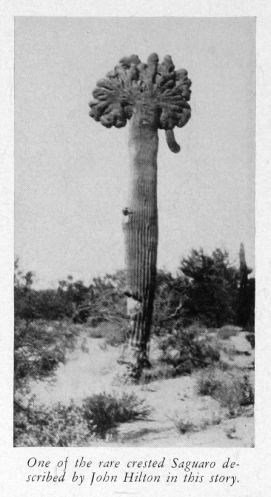 The Desert Magazine, May 1941 (photo by Harlow Jones) From the article 'Desert Roses' in Arizona by John W. Hilton: "As we neared the hills the giant cacti became larger and more abundant. On one of them we saw a fine crest. These crested Saguaro are rare indeed and scientists who are interested in this form of growth have catalogued all they have found in Arizona. No one knows for sure why a normal cactus suddenly begins throwing out this strange crest-like growth at the top. It is evident there is some disturbance of the cell structure, but laboratory study of the 'fan' has failed to disclose any evidence of disease or cancer. The fact remains that they are exceedingly rare among the Saguaro — and the chance of finding such a crest is about one in a million."