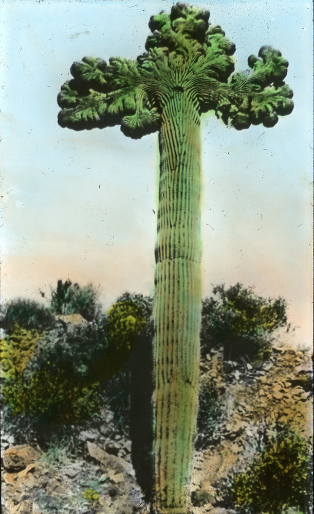 Lantern Slide, 1920s or 1930s Same saguaro as shown in postcard below.